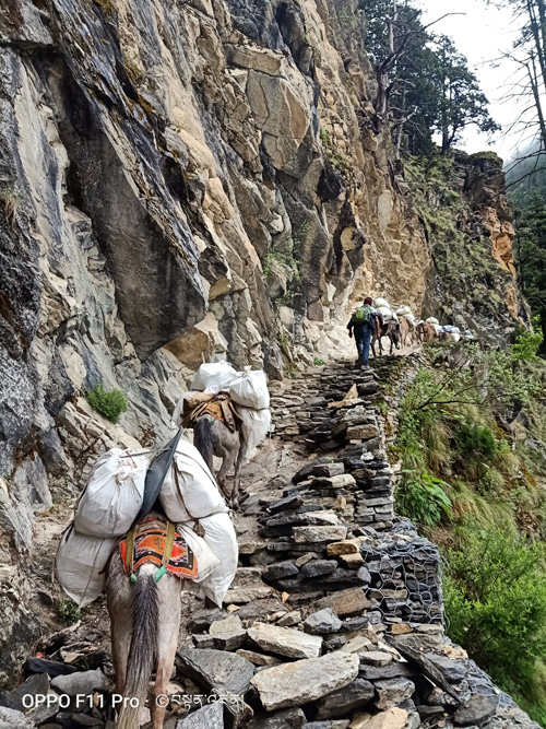 Gruber konnte im Mai eine Hilfslieferung, bestehend aus Kartoffeln, Reis, Nudel, Obst und Gemüse, organisieren, die mit 21 Muli in vier Tagesmärschen von Dunai in das kleine auf auf 4.050 m gelegene Dorf Doh Tarap im Dolpo-Distrikt gebracht werden konnte.